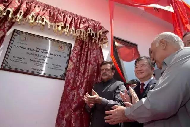 图:全国人大常委会副委员长、中国红十字会会长陈竺,中国驻巴基斯坦大使孙卫东,巴基斯坦港口航运部部长米尔·哈希尔·比赞久,巴基斯坦红新月会主席赛义德·伊拉希等为新落成的“中巴博爱医疗急救中心”揭牌;
