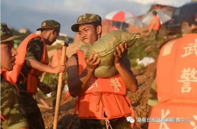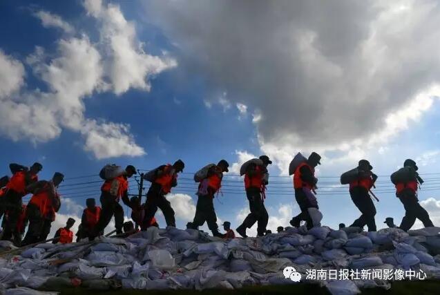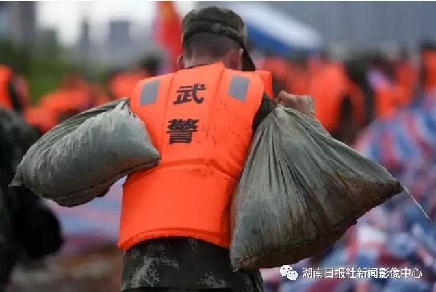 7月4日,高温下,武警湖南总队后勤基地的官兵在背扛沙袋抢险。他们奋战在抗洪抢险第一线,是洪水中用身躯筑起人堤、是烈日炙烤下的那一抹橄榄绿,他们不怕苦、不怕难全力?;と嗣竦纳撇踩?。 湖南日报记者 郭立亮 摄