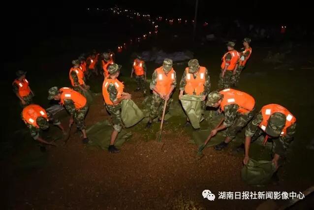 7月4日凌晨2时许,益阳市赫山区兰溪镇羊角村羊角电排附近,武警战士正在搬运沙袋护堤。湖南日报记者 唐俊 摄