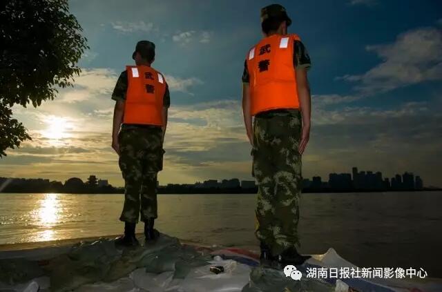 7月4日18时30分,长沙市湘江中路五水厂一泵房,武警总队医院卫训队的战士正在江边站岗,时刻关注江面变化,防止任何意外情况发生。
