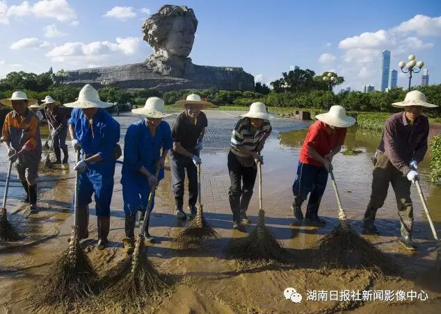7月4日,长沙橘子洲景区。工作人员清洗洪水留下的污泥,加快景区灾后恢复工作。傅聪 摄