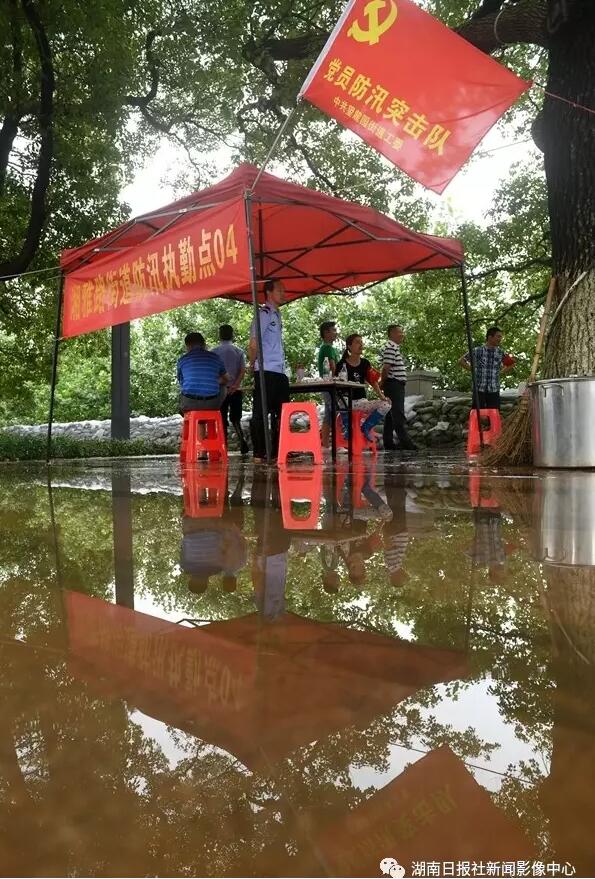7月3日,长沙市湘江大道湘雅路街道“党员防汛突击队”执勤点。湘江沿线几十万军民坚守大堤,党员干部群众铸起一道钢铁防线,鏖战湘江洪峰。湖南日报记者 郭立亮 摄