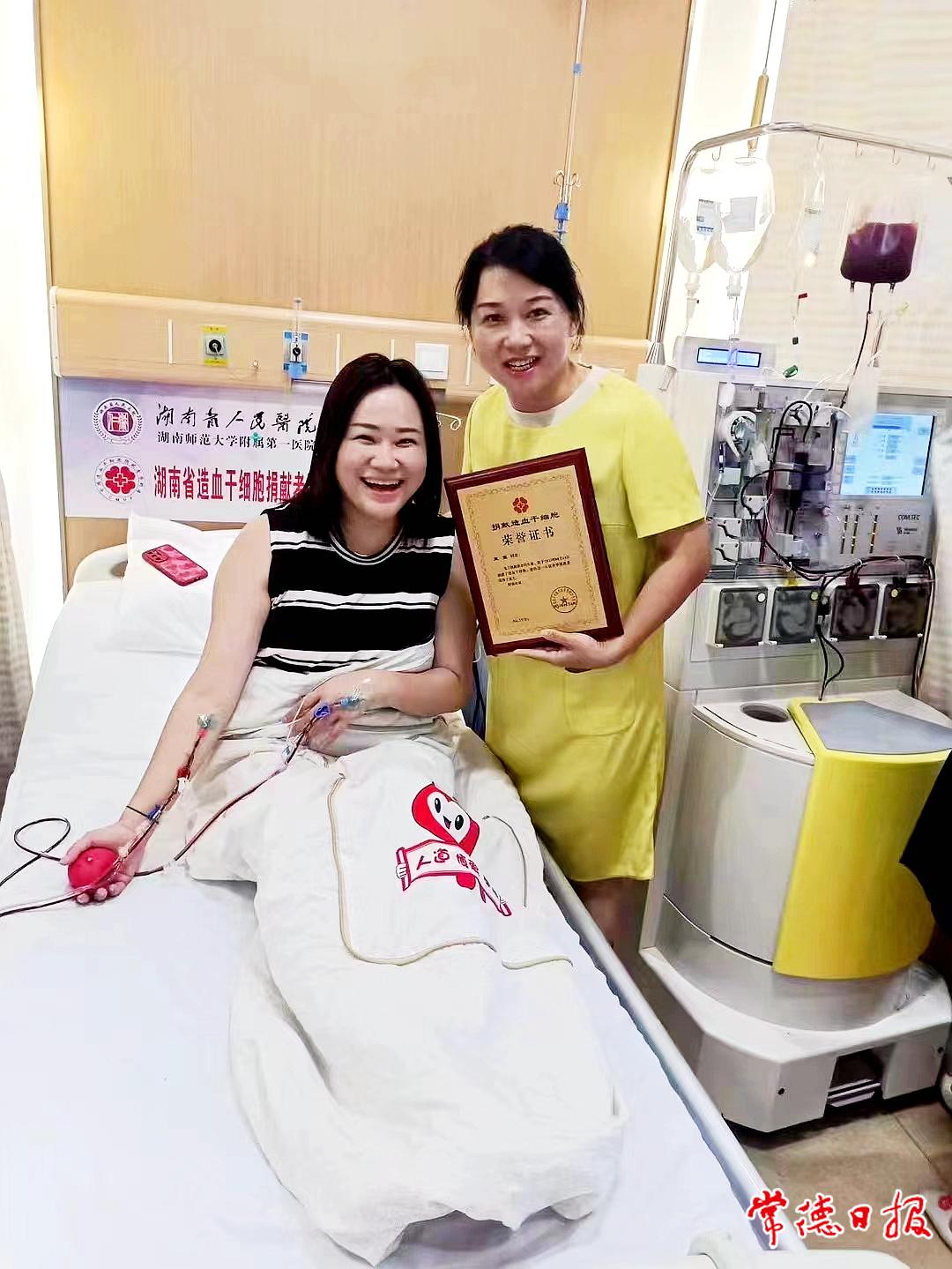 皇莹(左)采集造血干细胞的时留下灿烂的笑容。